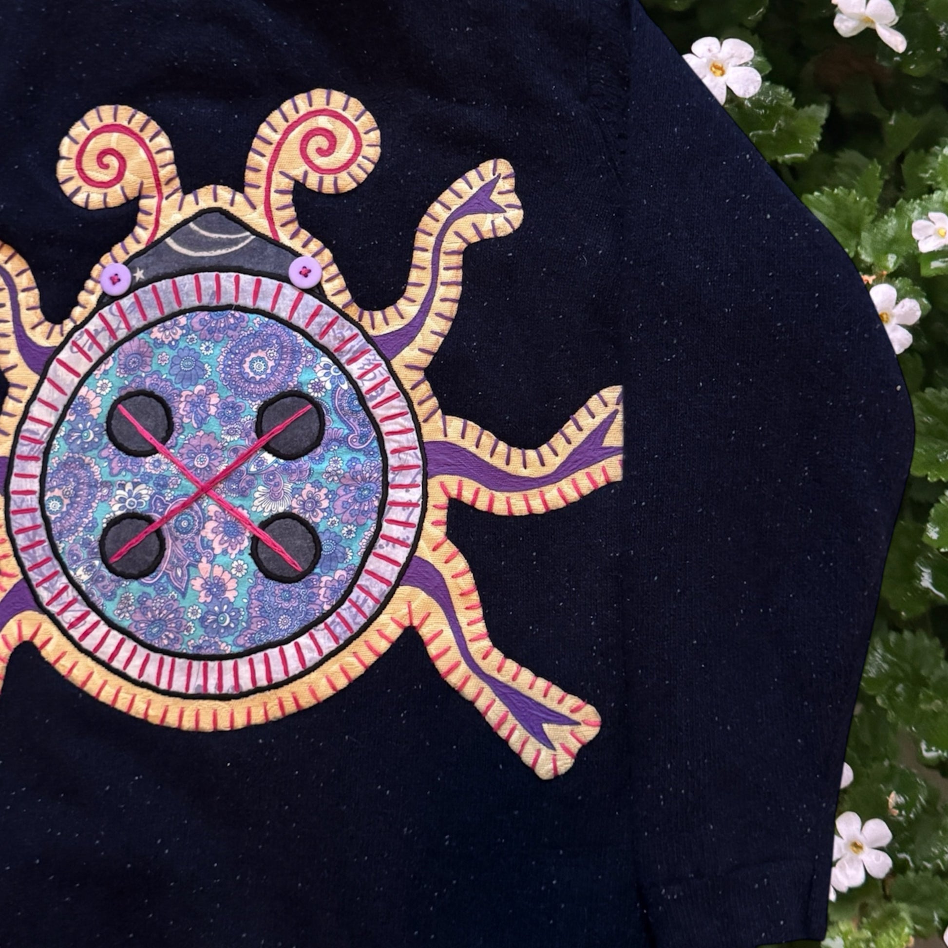 - Large button beetle fabric appliqué on the back