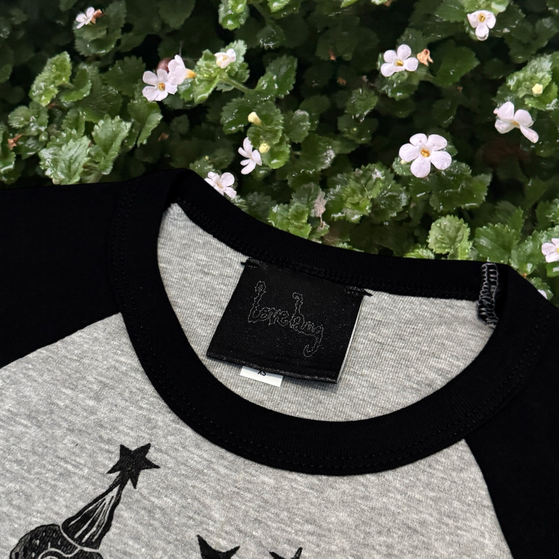 Hand printed grey & black raglan baby tee with 3/4 length sleeves!